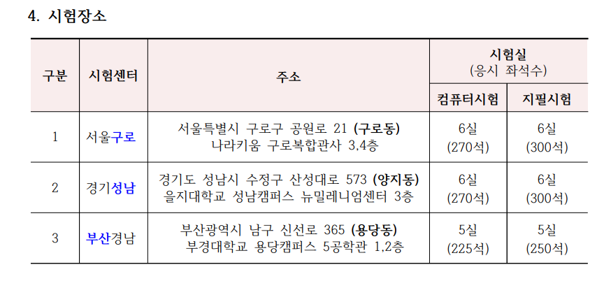 시험 장소는 서울은 구로에 위치합니다. 서울에 한군데 밖에 없다는 것이 놀랍네요. 워낙 시험을 많이 시행해서 일까요? 한 시험당 270명 또는 300명만 볼 수 있다는 것도 제약이 될 수 있겠습니다. 요양보호사 시험을 준비하고 계시다면 신청을 빠르게 하여서 미리미리 등록해놓는 것이 필요할 것 같습니다.