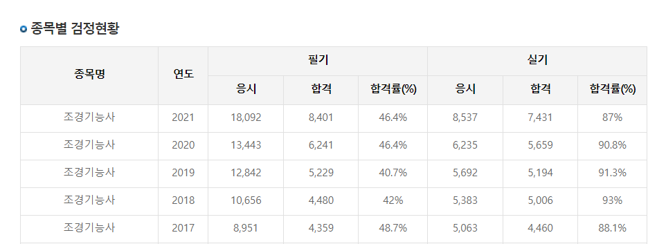 조경기능사는 최근들어 각광 받고 있는 자격증입니다. 자격증 취득자 수도 2021년에 7,431명으로 그 전에 비해 약 40%가량 상승했습니다. 그만큼 매년 7천명 정도의 조경기능사가 배출되고 있는 것입니다.