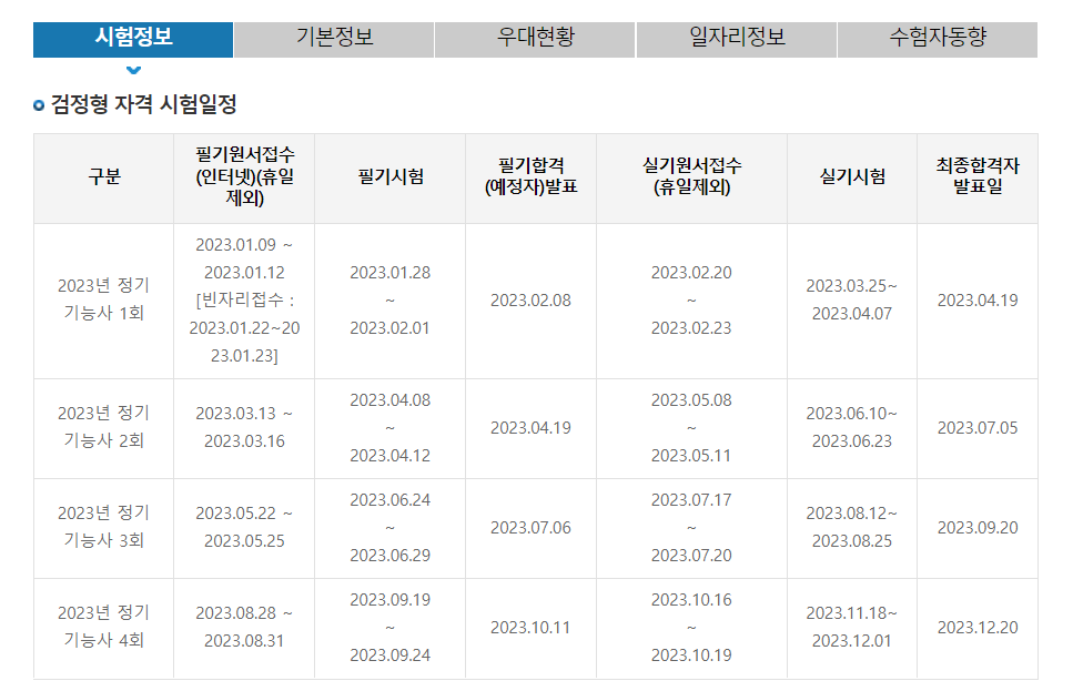게다가 실기시험도 동일하게 4번이 이뤄집니다. 필기 합격이 되고 나서 실기시험을 볼 수 있도록 시험일정이 조율되어 있으니, 필기와 실기를 모두 잘 준비해서 1년 내에 취득하는 것을 목표로 준비하시면 될 것 같습니다. 4개월내에도 취득하시는 분들도 있다고 합니다.