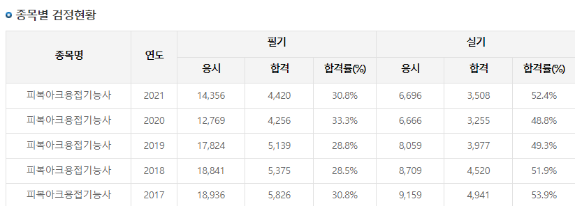위 내용은 최근 5년간의 용접기능사 합격률입니다. 필기의 합격률이 30%내외 입니다. 꽤나 낮은 수준입니다. 평균 60점을 맞는 필기 시험인데, 필기가 조금 어려운 듯 보이고, 실기는 50%이상의 합격률을 보여주고 있습니다.