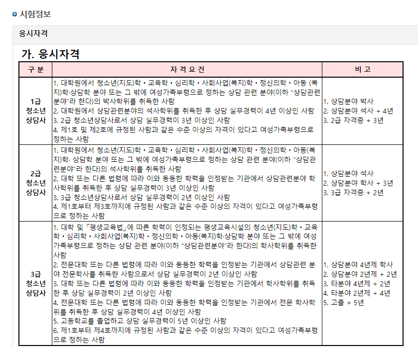 기재된 응시자격이 지금까지 제가 다뤘던 자격증 중 가장 깁니다. 우선 3급의 경우에도 상담분야 학사를 졸업해야 바로 준비를 할 수 있고, 2,1급은 석사를 나와야 가능합니다.