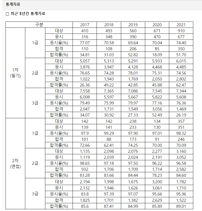 워낙 응시자격이 까다롭고 1년에 한번만 시험이 이뤄지기 때문에 쉽지는 않은 시험입니다. 게다가 필기 시험합격률도 낮은 만큼 준비를 하신다면 시간을 넉넉하게 잡고 준비를 하시는것을 추천드립니다.