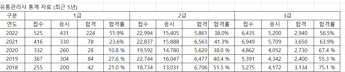 유통관리사 1급의 경우에는 더욱 심해서 2022년도만 50%를 넘겼을 뿐, 그외에는 10%의 합격률을 기록한 해도 있습니다.