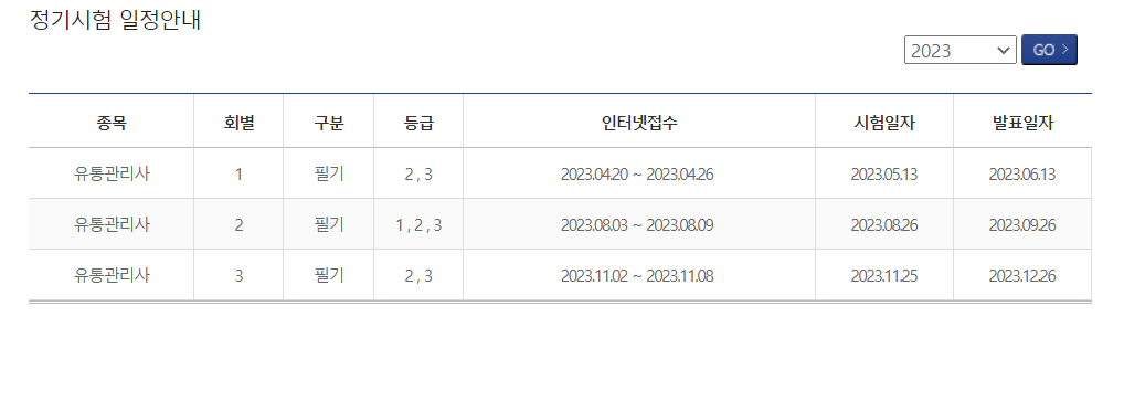 2023년 시험일정은 2,3급은 총 3번의 시험일정이 있습니다. 그런 면에서는 크게 부담이 되지 않는다고도 볼 수있겠습니다. 그러나 유통관리사 1급의 경우에는 시험이 단 한번, 2023년 8월에 예정되어있습니다. 만약 유통관리사 1급을 준비하시는 분이라면 조금 부담이 되실 수도 있겠습니다.