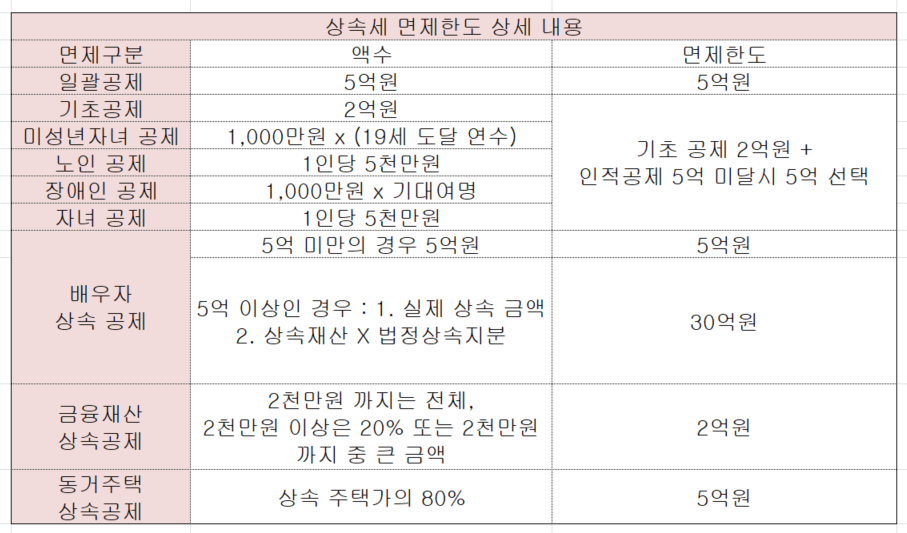 그렇다면 앞서 말씀드린 공제가 되는 금액 면제한도에 대해 알아보겠습니다. 이 내용은 꽤나 복잡 하니, 대략적으로 확인하시고 상속 금액이 많은 분들은 필히 세무사등 전문가와 상담해주시기 바랍니다.