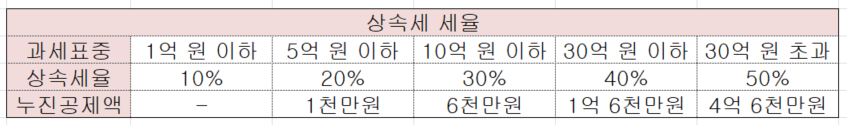 이 2가지 공제가 모두 이루어진 후에 남은 금액에 대한 상속세율이 바로 아래 내용입니다.