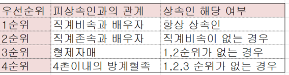 그 순위는 위와 같습니다. 배우자는 언제나 최 상위 순위에 포함됩니다. 이유는 함께 재산을 축적하고 생성하는데 가장 큰 기여를 했다고 판단하기 때문입니다. 직계비속은 흔히 말하는 자식, 존속은 부모를 뜻합니다.