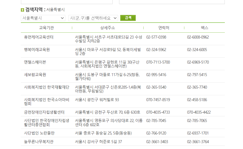 서울의 경우 위 10곳이 교육기관입니다. 서초, 마포, 광진 등 두루두루 여러 곳에 위치해 있는 것을 보실 수 가 있습니다.