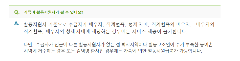 또한 요양보호사와 차이를 보이는 지점이 있습니다. 요양보호사의 경우 가족을 돌보는 것도 업무 범위에 속하지만 장애인활동 지원사는 지원되지 않습니다.