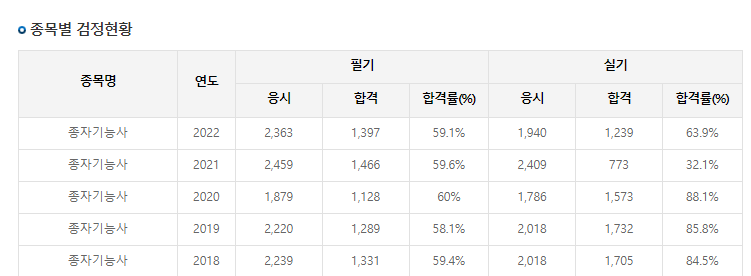 종자기능사는 젊은층에서는 공무원 시험에 가산점이 있어서 준비를 하였으나 그 공부의 범위와 양에 비해 높은 가산점은 아니라 인기가 그다지 높지는 않습니다. 한 해에 자격증을 취득하는 사람의 숫자도 1,500명 안팎으로 많지도 적지도 않은 수준입니다.