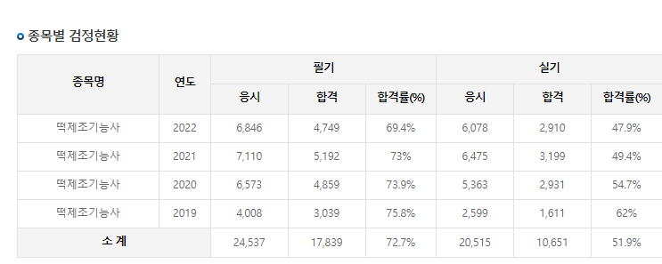 제과, 제빵 기능사의 경우 두 기능사를 모두 합쳐서 3만명씩 배출이 되고 있습니다. 그 10%정도 되는 인원이니 아직은 많아보이지 않습니다.