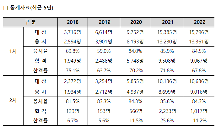 올해 시험까지는 아직 합격률이 발표되지는 않았습니다. 작년 시험은 1차는 67%합격률로 꽤나 높았고 2차는 11.2%였습니다. 합격률은 매년 올라가거나 내려가기를 반복하고 있습니다.