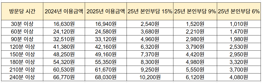 위 표는 2025년 기준 수가표입니다. 이용 시간에 따라 본인부담금이 달라지는 것을 확인할 수 있습니다. 일반적으로 최소 3시간 이상 이용하는 경우가 많으므로, 하루 약 9,000원 정도의 비용이 발생한다고 예상할 수 있습니다.